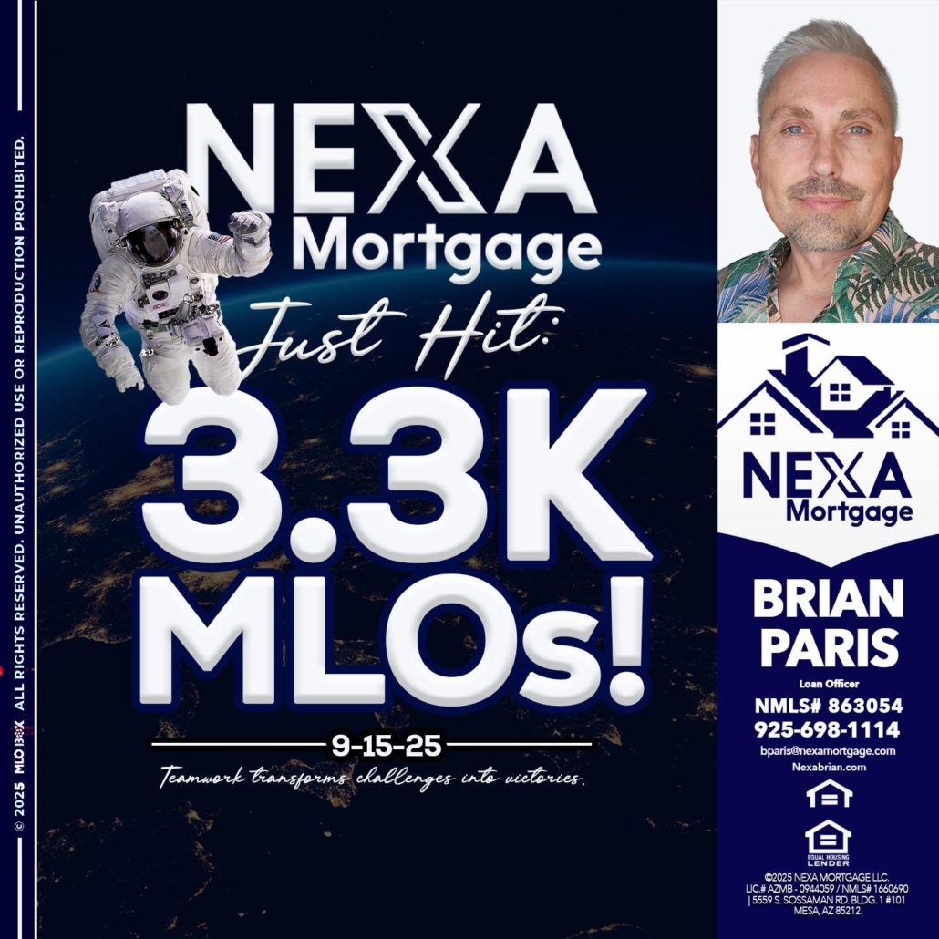 3.3K - Brian Paris -Loan OfficerHi, my name is Brian Paris. I’m a Loan Officer with NEXA Mortgage LLC., offering personalized mortgage solutions, fast customized quotes, great rates and service with integrity.