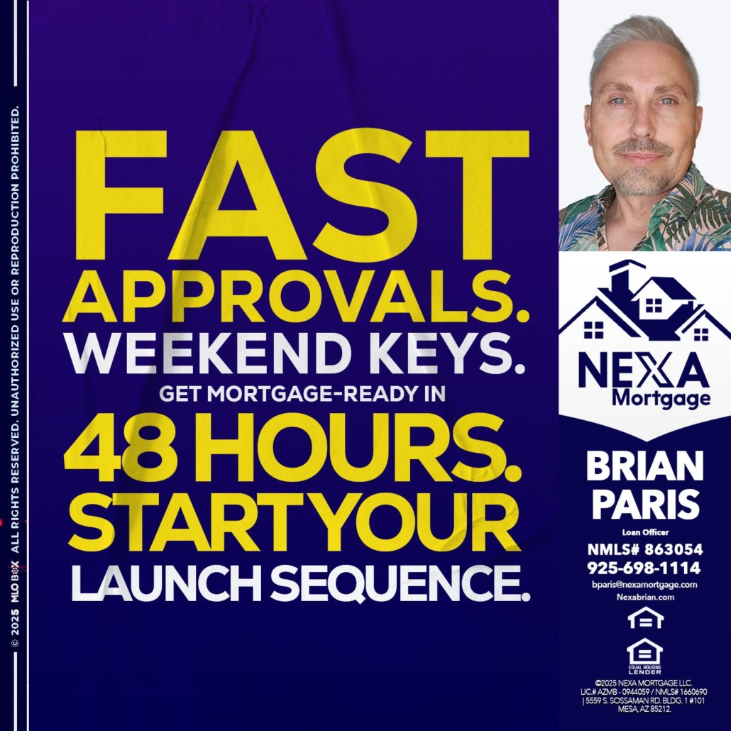 Hi, my name is Brian Paris. I’m a Loan Officer with NEXA Mortgage LLC., offering personalized mortgage solutions, fast customized quotes, great rates and service with integrity.