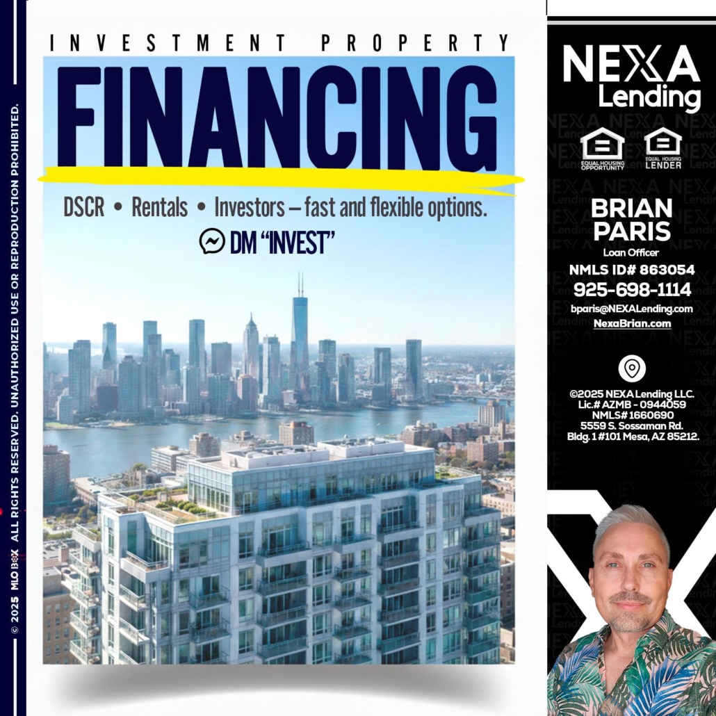 FINANCING - Brian Paris -Loan OfficerHi, my name is Brian Paris. I’m a Loan Officer with NEXA Lending LLC., offering personalized mortgage solutions, fast customized quotes, great rates and service with integrity.