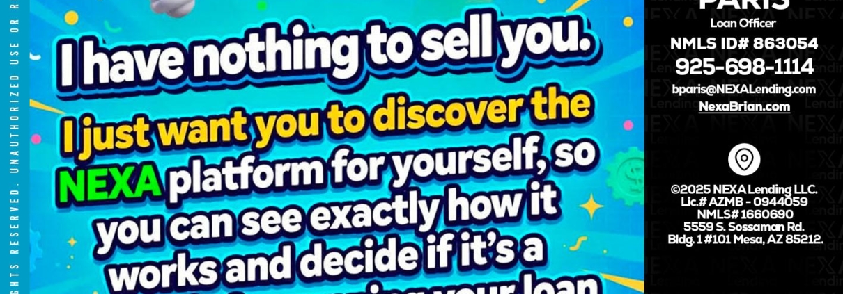 Hi, my name is Brian Paris. I’m a Loan Officer with NEXA Lending LLC., offering personalized mortgage solutions, fast customized quotes, great rates and service with integrity.
