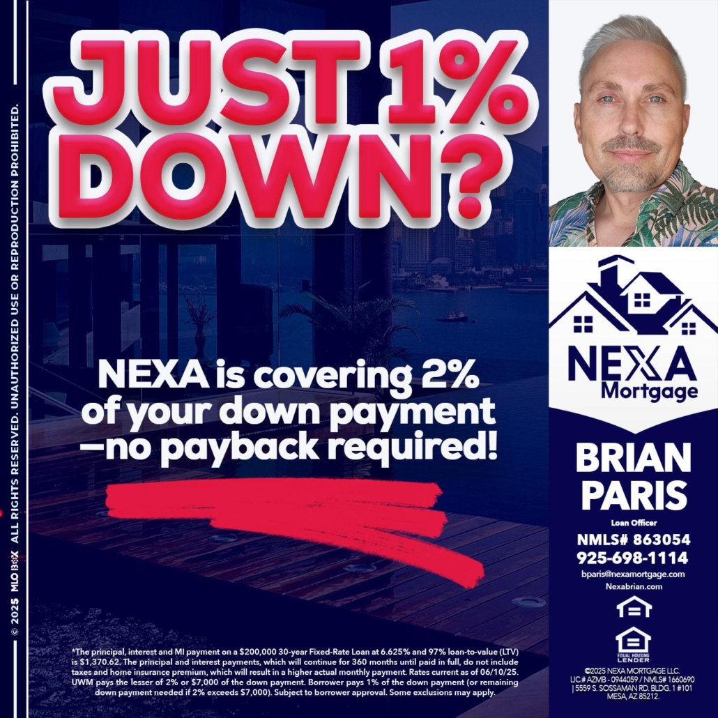 Hi, my name is Brian Paris. I’m a Loan Officer with NEXA Mortgage LLC., offering personalized mortgage solutions, fast customized quotes, great rates and service with integrity.