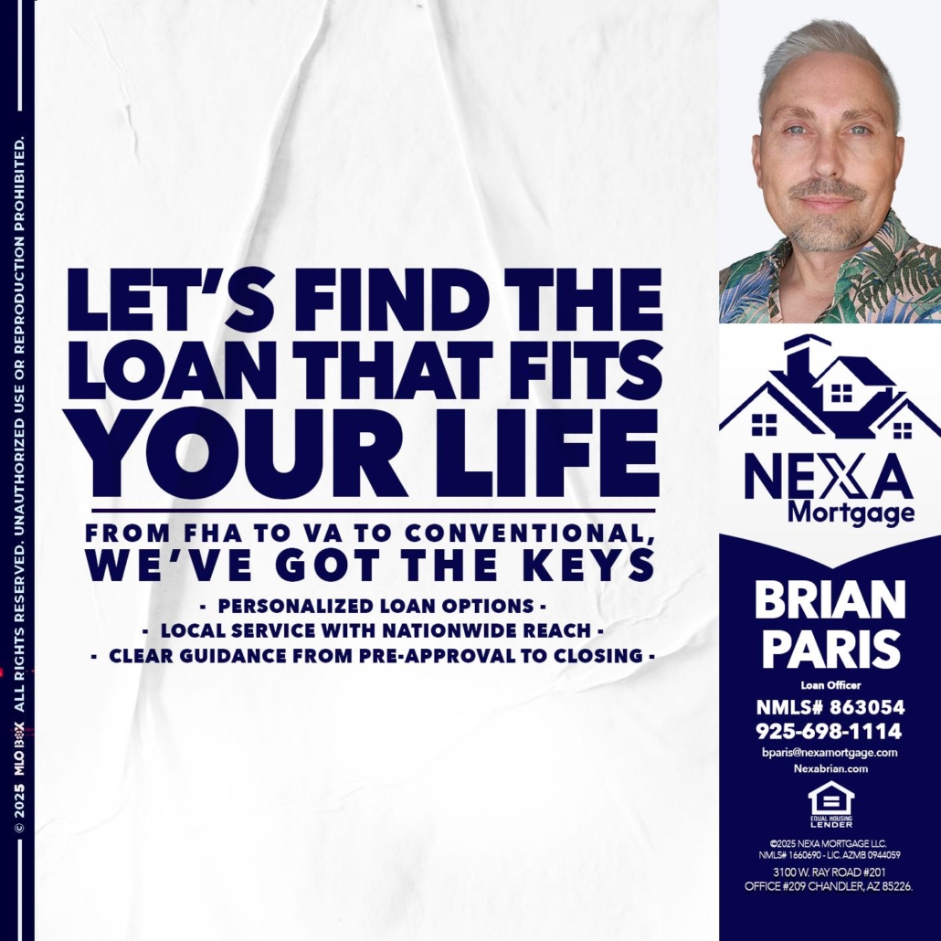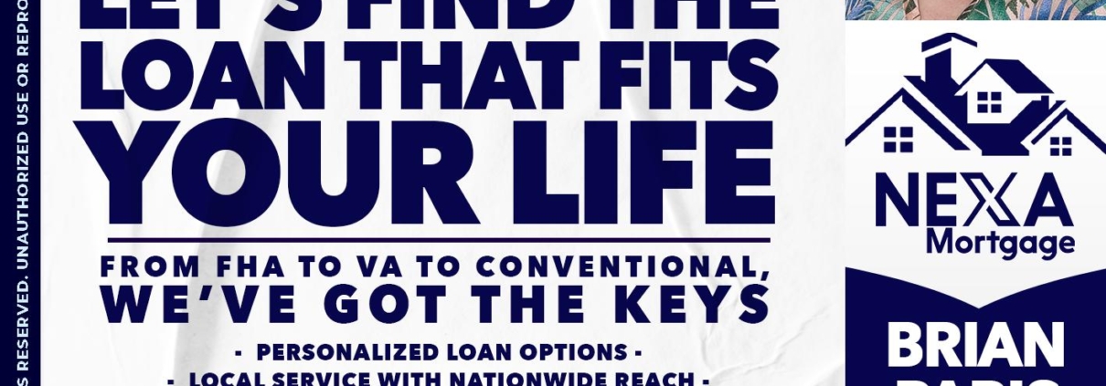 Hi, my name is Brian Paris. I’m a Loan Officer with NEXA Mortgage LLC., offering personalized mortgage solutions, fast customized quotes, great rates and service with integrity.