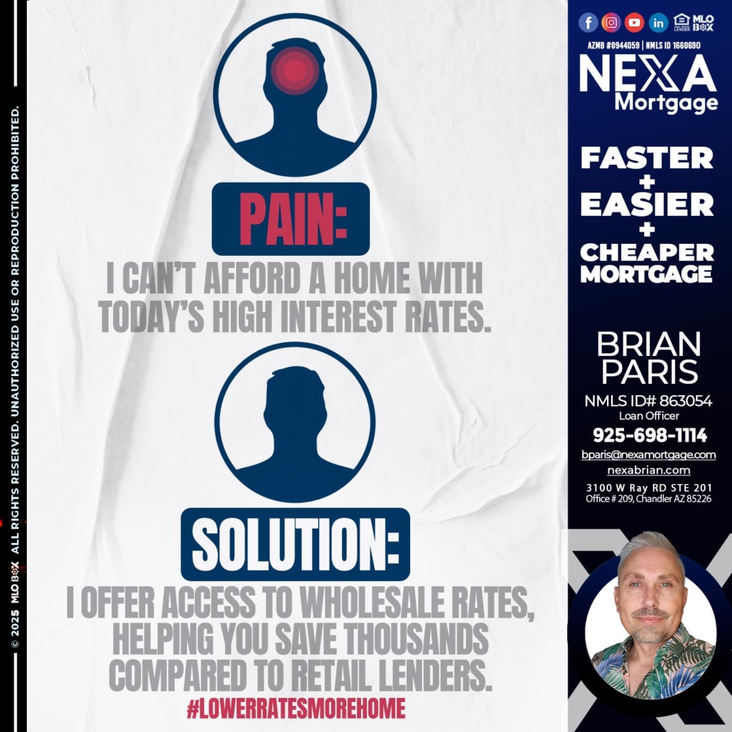 Hi, my name is Brian Paris. I’m a Loan Officer with NEXA Mortgage LLC., offering personalized mortgage solutions, fast customized quotes, great rates and service with integrity.