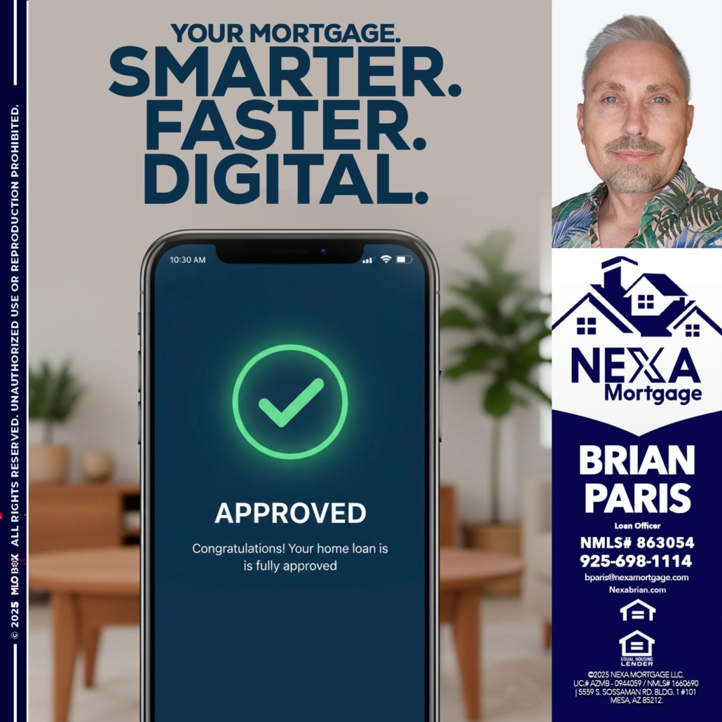 smarter faster digital - Brian Paris -Loan OfficerHi, my name is Brian Paris. I’m a Loan Officer with NEXA Mortgage LLC., offering personalized mortgage solutions, fast customized quotes, great rates and service with integrity.