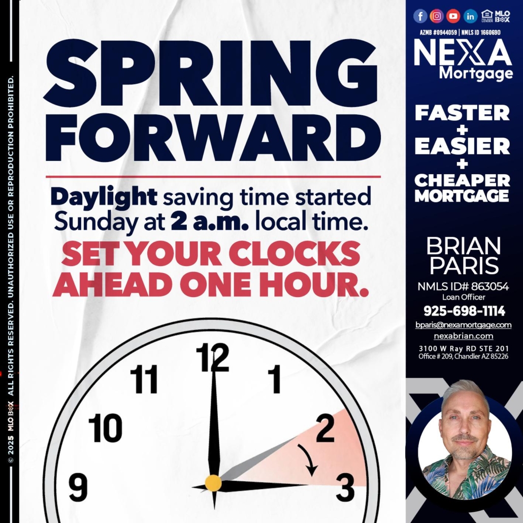 SPRING FORWARD - Brian Paris -Loan OfficerHi, my name is Brian Paris. I’m a Loan Officer with NEXA Mortgage LLC., offering personalized mortgage solutions, fast customized quotes, great rates and service with integrity.