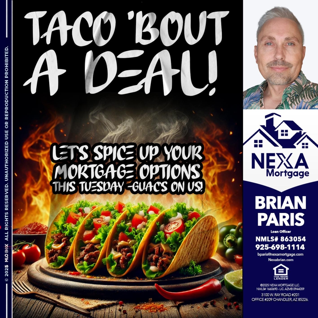 TACO BOUT - Brian Paris -Loan OfficerHi, my name is Brian Paris. I’m a Loan Officer with NEXA Mortgage LLC., offering personalized mortgage solutions, fast customized quotes, great rates and service with integrity.