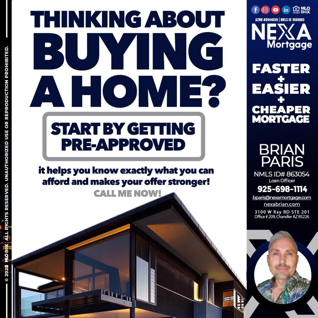 Hi, my name is Brian Paris. I’m a Loan Officer with NEXA Mortgage LLC., offering personalized mortgage solutions, fast customized quotes, great rates and service with integrity.