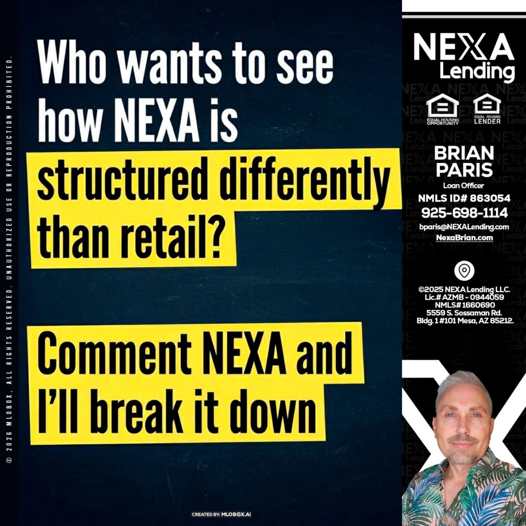 who want to see - Brian Paris -Loan OfficerHi, my name is Brian Paris. I’m a Loan Officer with NEXA Lending LLC., offering personalized mortgage solutions, fast customized quotes, great rates and service with integrity.