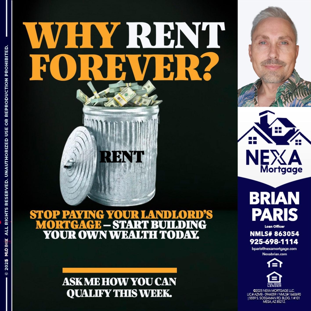 Hi, my name is Brian Paris. I’m a Loan Officer with NEXA Mortgage LLC., offering personalized mortgage solutions, fast customized quotes, great rates and service with integrity.